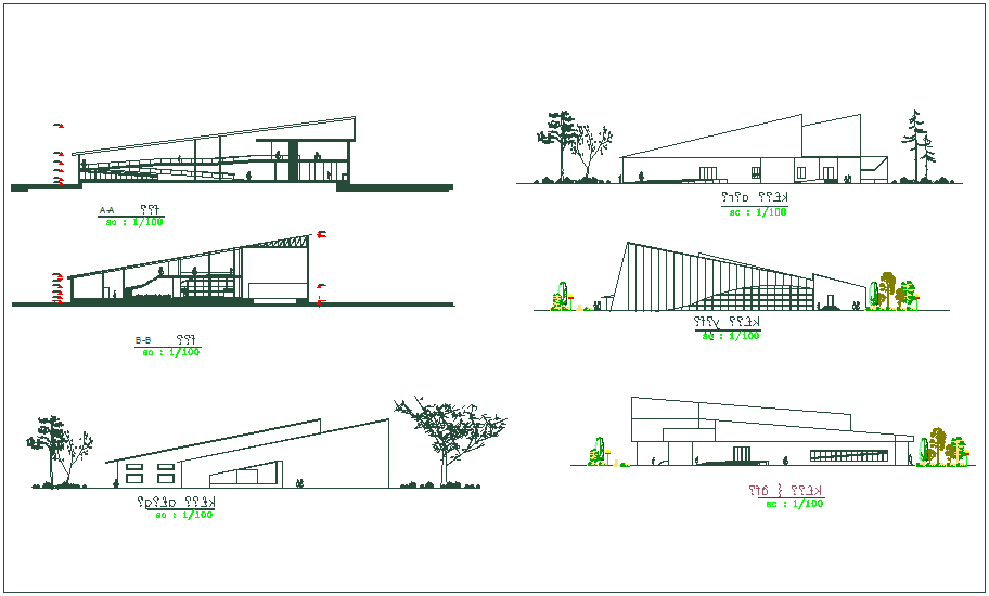 Elevation and different axis section view for art gallery building dwg file in elevation with view of floor,floor level,wall,door and window view wall support view and different section with view of floor,floor level,wall,door and window and view of wall and wall support view with necessary dimension.