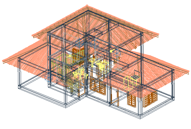 Family residence in 3 D plan dwg file, with furniture detail in door and window detail, etc.