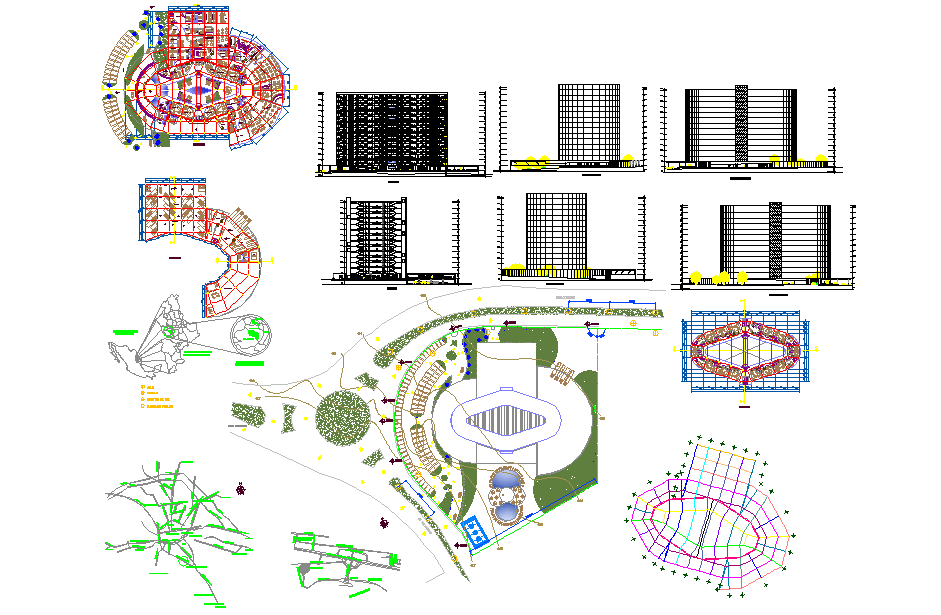 This High-Rise Hotel Building Design in AutoCAD offers a complete architectural layout featuring detailed floor plans, façade elevations, structural drawings, and an expansive landscape design. The plans showcase a modern multi-story hotel with well-organized guest rooms, lounges, corridors, and service zones arranged for smooth circulation and operational efficiency. The curved building form, structural grid distribution, and core planning highlight the designer’s focus on stability and spatial harmony. Elevation views further illustrate the tower’s architectural rhythm, window placement, and vertical symmetry, giving professionals a clear understanding of its construction style and external appearance.