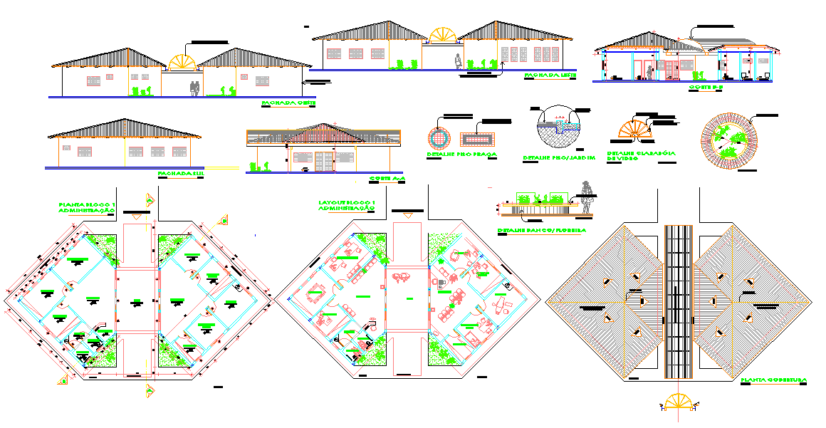 This Clinic Centre Design DWG presents a complete architectural solution featuring detailed floor plans, elevations, interior layouts, and structural elements. The drawing showcases a well-organized healthcare facility divided into consultation rooms, treatment areas, waiting lounges, administration offices, and support zones, all arranged to ensure smooth circulation for patients and staff. The plan includes symmetrical block layouts with landscaped courtyards at the center, enhancing natural ventilation and daylight flow within the building. Multiple façade elevations highlight the roof design, openings, and architectural style, offering a clear visualization of the clinic’s exterior character.