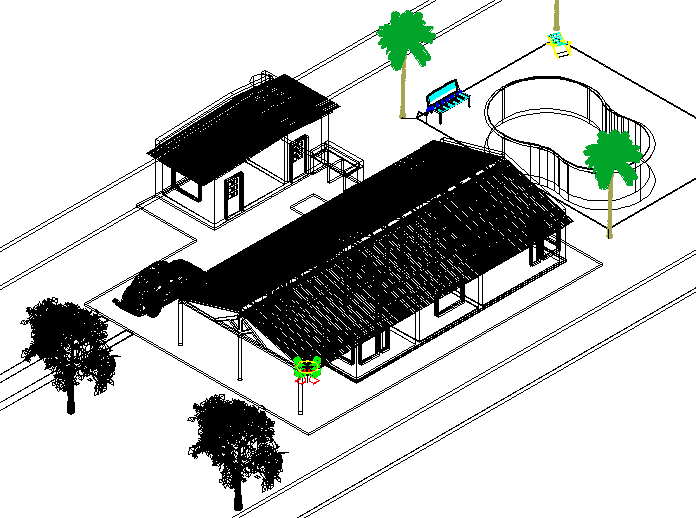 Farm house 3 d plan detail dwg file, with swimming pool detail landscaping detail in tree detail, bench detail etc.