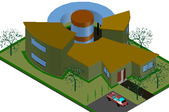 Housing project in 3 d plan detail dwg file, including round shape building plan detail, car parking detail, tree and plant detail, etc.