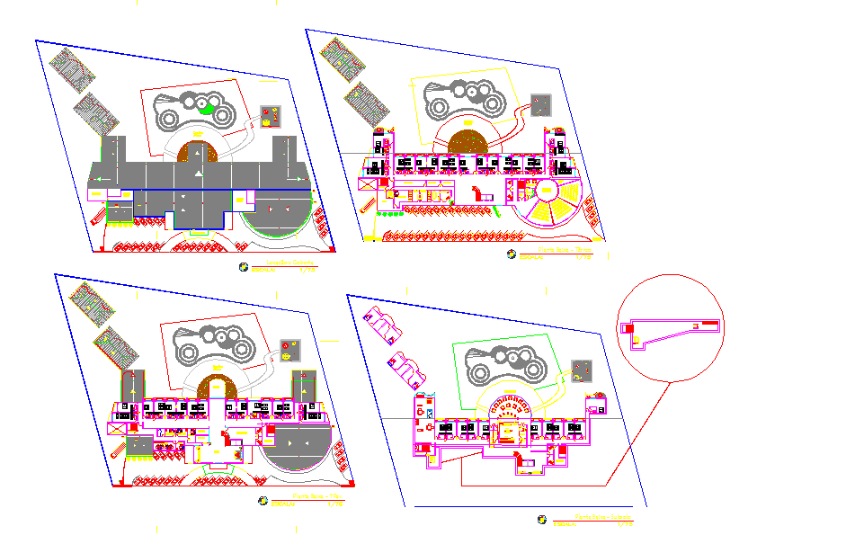 This Modern Hotel Design Detail DWG presents a comprehensive floor layout that showcases a contemporary hospitality project with refined spatial planning. The drawing includes clearly structured zones such as guest rooms, reception areas, corridors, administrative offices, service spaces, and central lounge areas. Each plan demonstrates how circulation flows efficiently from one block to another, ensuring convenience for both guests and staff. The use of landscaped elements, open seating areas, and exterior recreational spaces adds a dynamic visual appeal while improving environmental quality around the hotel. Multiple layout variations displayed in the design help users understand different functional arrangements and façade treatments within the same site.