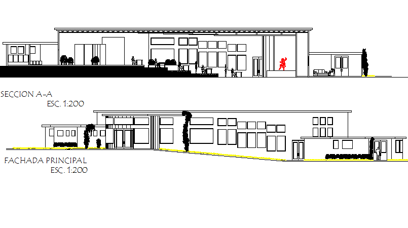 Elevation and section Art gallery project plan detail dwg file, with scale 1:20 detail, landscaping detail in tree and plant detail, front elevation detail, etc.