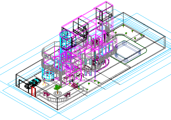 3 D house plan detail dwg file, including landscaping detail in tree and plant detail, car parking detail, main gate reeling detail, etc.