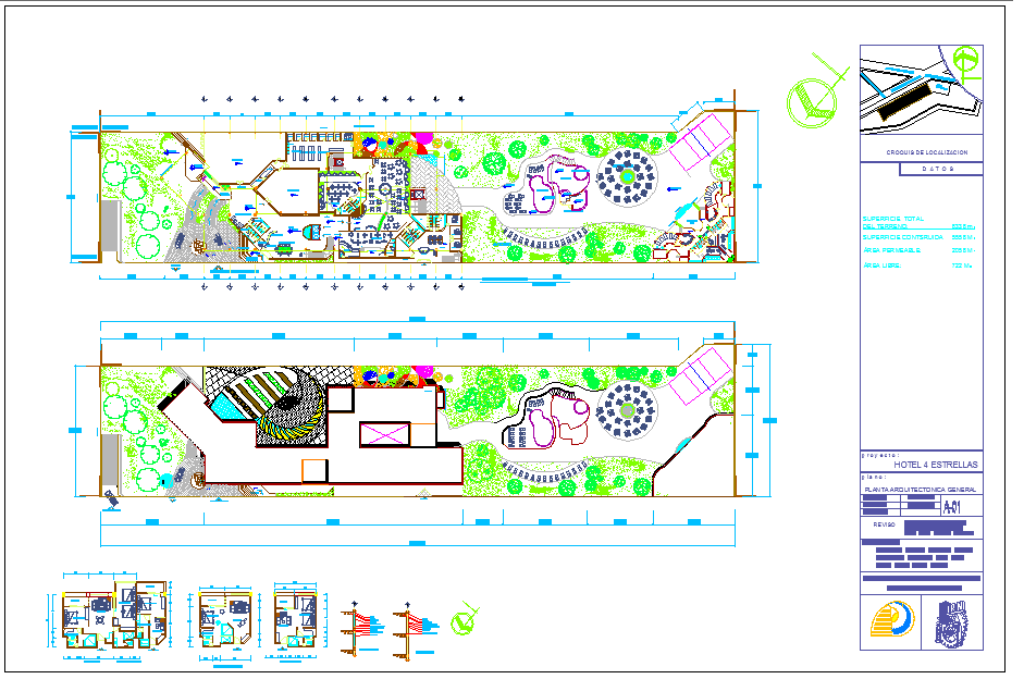 Additionally, the design features a detailed pool area, outdoor seating zones, and beautifully arranged garden pockets that contribute to a resort-style aesthetic. Smaller layout diagrams at the bottom of the sheet provide room-level detailing and sectional views, offering deeper insight into the building’s vertical and spatial organization. This project is an excellent reference for architects, civil engineers, interior designers, and landscape planners involved in hospitality development. It demonstrates how thoughtful integration of structure, outdoor amenities, and landscape design can elevate the guest experience while maintaining modern standards of style, accessibility, and functionality. Overall, the DWG serves as a complete guide for designing elegant and efficient hotel environments.