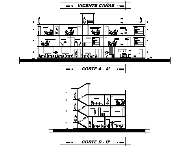 Section building school plan detail dwg file, with section A-A’ detail, section B-B’ detail, table, chair, door, sofa and window detail, dimension detail, etc.