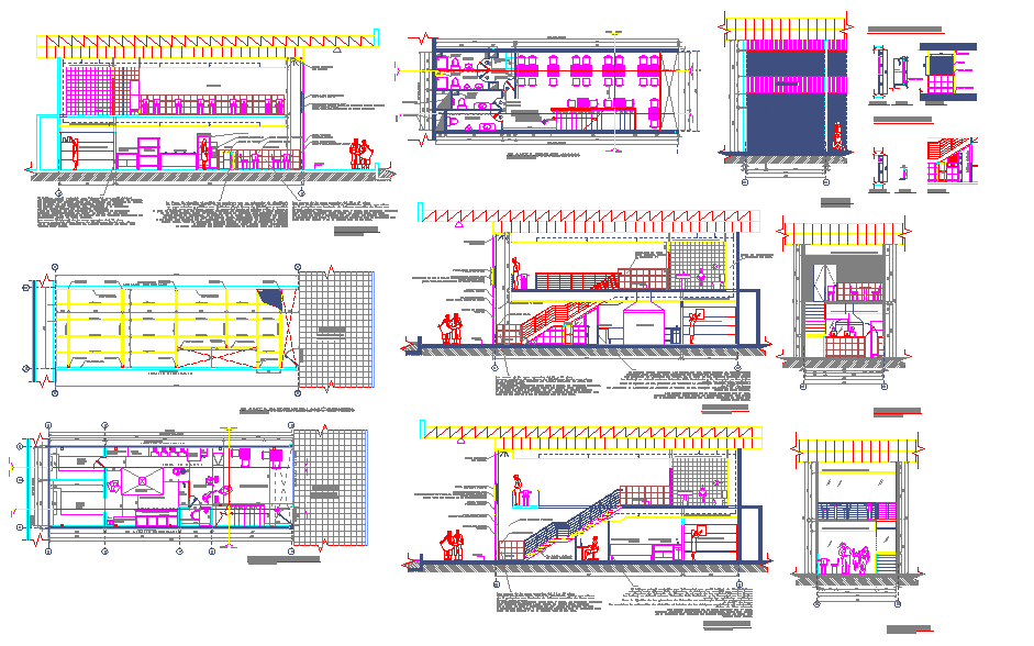 This Simple Restaurant Design DWG presents a well-organized layout supported by detailed sectional drawings and interior arrangements suitable for small to medium-sized dining establishments. The plans illustrate the complete functional setup of the restaurant, including the dining hall, service counters, kitchen layout, preparation areas, and access points. Each section clearly shows how the space is divided horizontally and vertically, offering insight into ceiling heights, structural framing, staircases, and service connections. The design ensures smooth circulation for both staff and customers, with clearly marked pathways and logically arranged seating to enhance overall dining comfort.