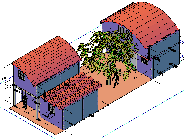 3 D house plan detail dwg file, with landscaping detail in tree detail, dimension detail, roof elevation view detail, etc.