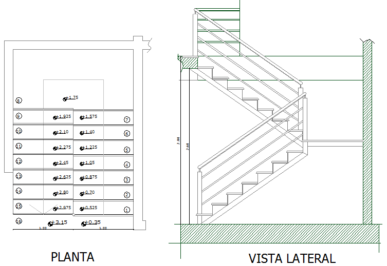 Stair plan and section detail dwg file, with dimension detail, hand reeling detail, leveling detail, etc.