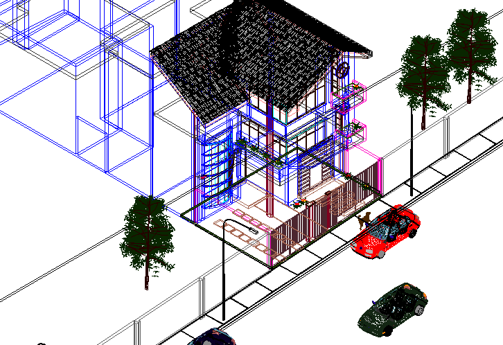 House 3 D plan detail dwg file, with landscaping detail in tree and plant detail, car parking detail, etc.