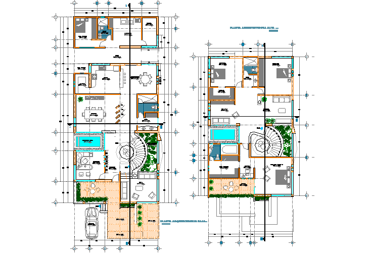Architect design house plan detail dwg file, including center line plan detail, landscaping detail in tree and plant detail, car parking detail, etc.