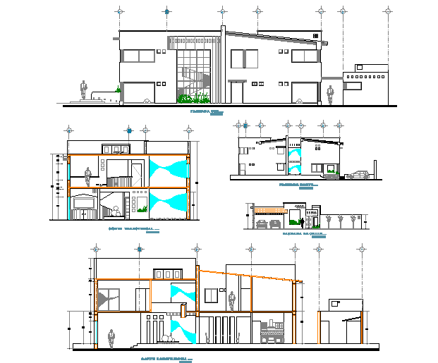Section and elevation house plan detail dwg file, including section A-A’ detail, section B-B’ detail, front elevation detail, center line plan detail, etc.