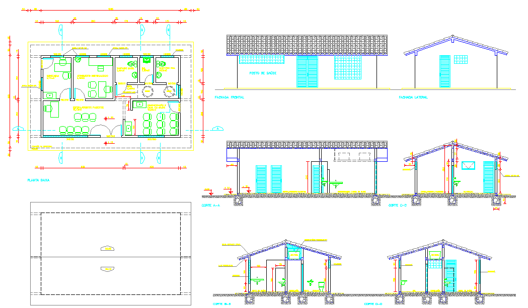The project also includes front, side, and sectional elevations that highlight the building’s architectural simplicity and practical construction style. The use of a pitched roof, natural ventilation openings, and balanced window placement supports a comfortable indoor atmosphere. The sectional drawings reveal structural elements, foundation detailing, and internal height distribution, helping architects and builders understand the technical aspects of the design. With its straightforward layout and thoughtful spatial planning, this design serves as an excellent reference for professionals developing small medical facilities. It is ideal for healthcare planners, architects, engineers, and students seeking guidance on creating accessible, efficient, and cost-effective health centre buildings