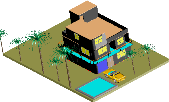 Planning 3 D house plan detail dwg file, with swimming pool detail, car parking detail, landscaping detail in tree detail, etc.