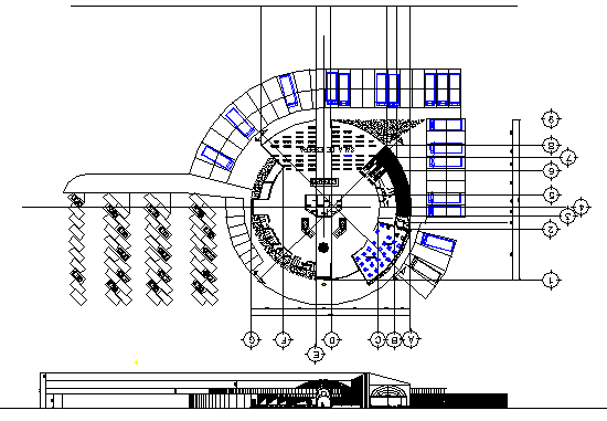 Bus station plan and section detail dwg file, including center line plan detail, dimension detail, bus parking detail, etc.