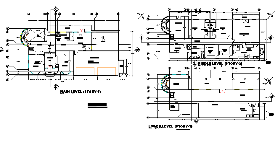Planning Split level house hill side detail dwg file, with north direction detail, center line plan detail, dimension detail, naming detail, etc.