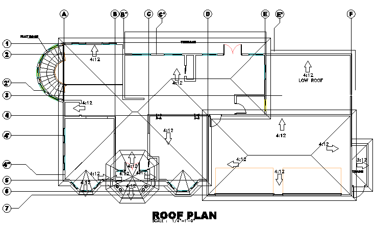 Roof house plan detail dwg file, with center line plan detail, stair detail, lower roof plan detail, etc.