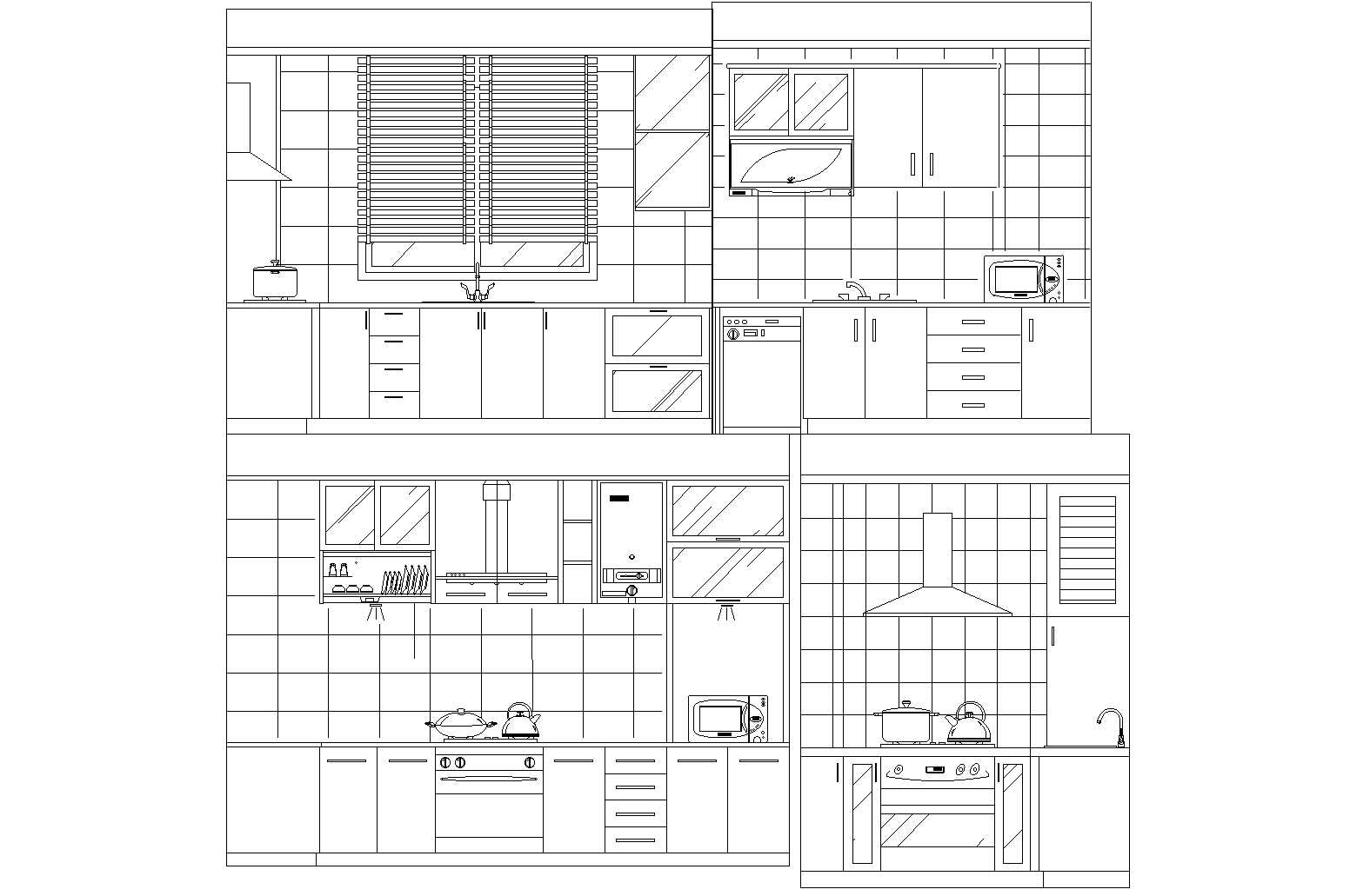 Kitchen plan with options. 2D view of Kitchen plan details with drawers, sink, micro-oven, etc., Plan and elevations of the front, sided view with fully furnished kitchen.