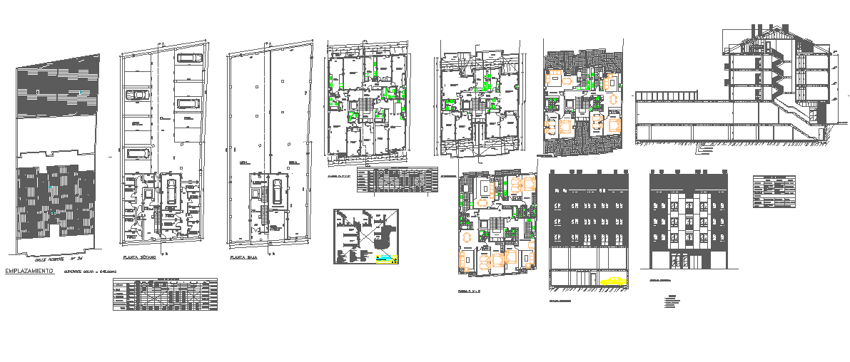 This Modern Apartment House Detail Plan presents a complete architectural layout of a multi-story residential building designed with precise measurements and clear structural organization. The drawing includes detailed floor plans, elevations, and sectional views that show how different apartment units are arranged across multiple levels. Important areas such as living spaces, bedrooms, staircases, corridors, and service zones are highlighted with accurate annotations to support correct construction work. The layout provides a clear understanding of interior circulation and the overall planning strategy followed for efficient residential design.
