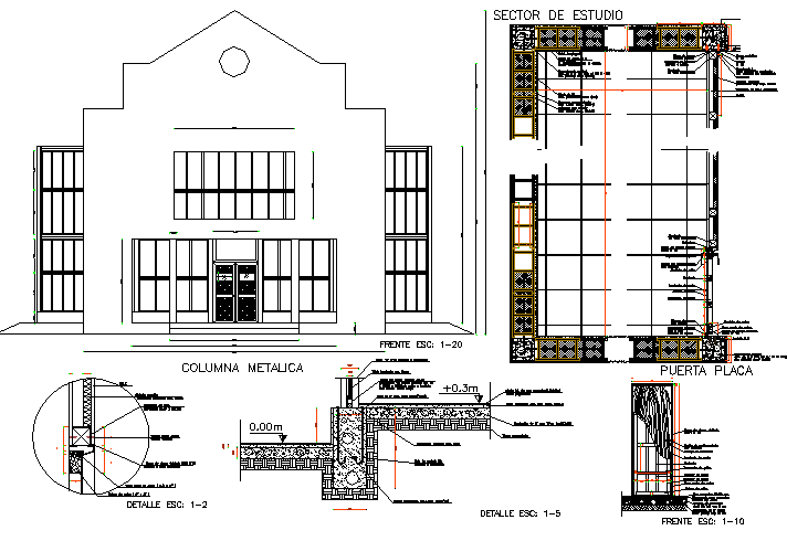 Front elevation and door detail dwg file, with wall section detail, dimension detail, naming detail, scale 1:20 detail, etc.