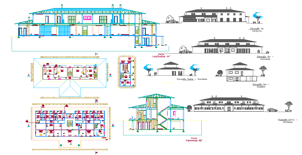The drawing also contains detailed front elevations, side elevations, longitudinal sections, and transverse sections that highlight the structural framework of the hotel. Features such as roof outlines, façade detailing, column grids, staircase placement, and exterior compositions are clearly presented to support design development and construction planning. This layout is ideal for architects, civil engineers, interior designers, and students studying hospitality design. The combination of detailed structure views and interior planning makes this drawing a valuable reference for medium to large-scale hotel projects that require accurate coordination between architectural elements and efficient space management.