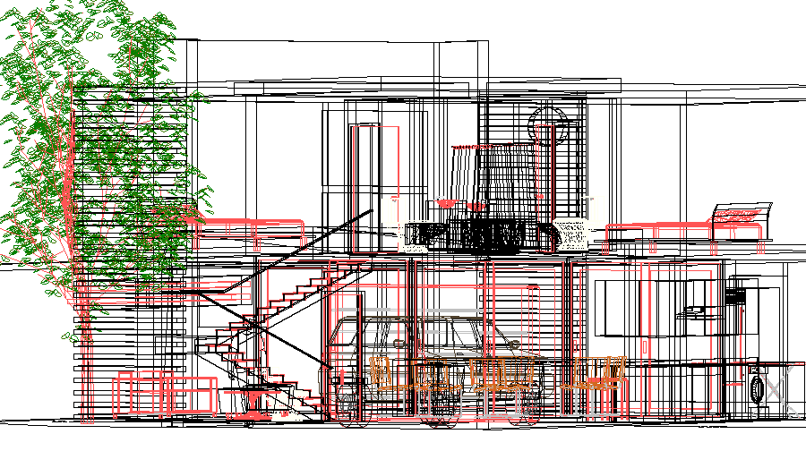 3 d beach house plan detail dwg file, including landscaping detail in tree detail, car parking detail, stair detail, etc.