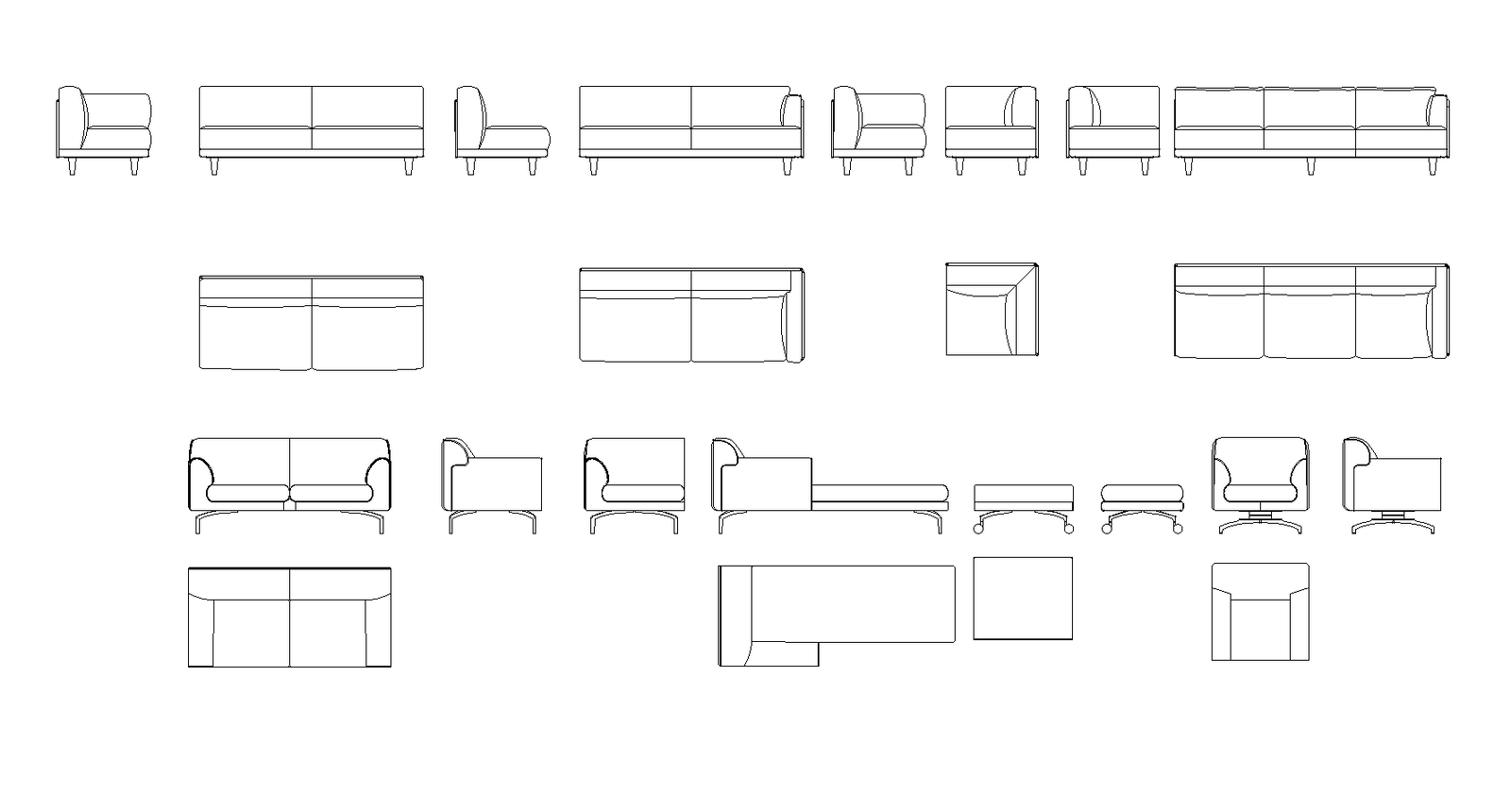 Library of sofa plan in 2D. Sofas are designed in three-seaters and two-seaters, etc., The plan and (front & side) elevations are viewed in AutoCAD. According to the needs and sizes, and sofas are designed.