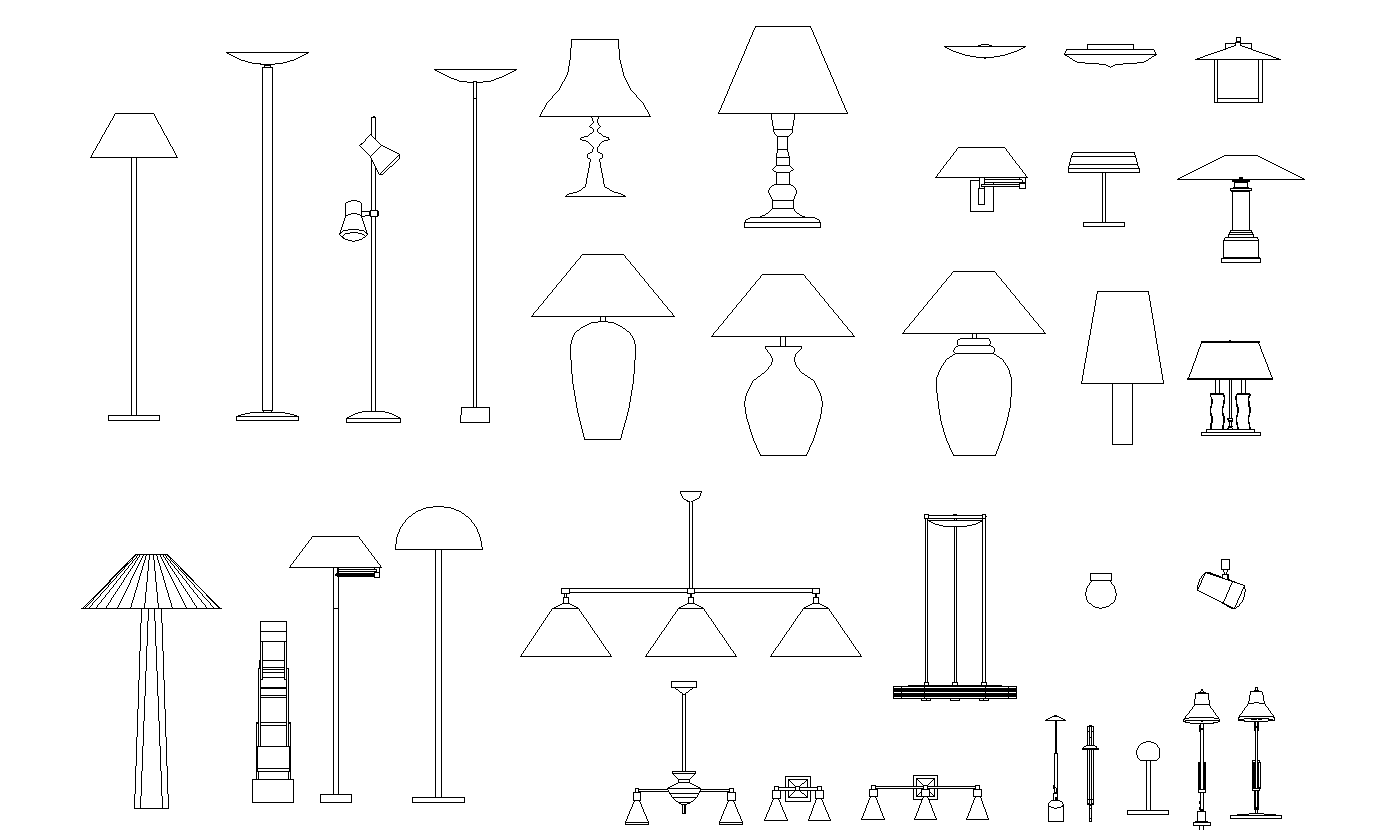 Lamp plan. Floor lamp, Ceiling lamp and table lamp designs in 2D AutoCAD. Options can be seen in this plan for different purposes. Different sizes can be placed in different spaces for one's utilization.