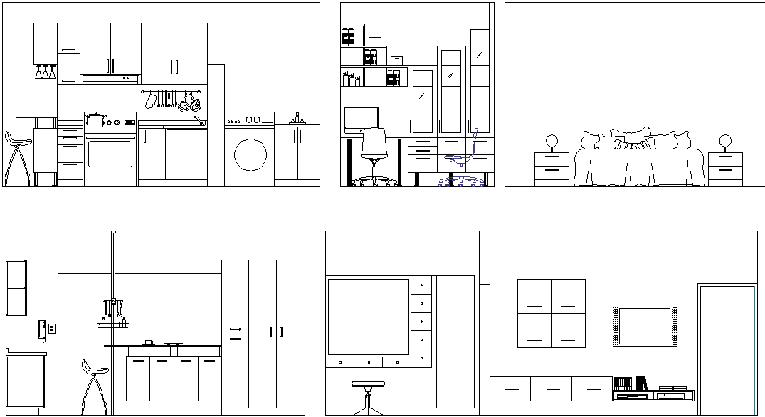 Section rooms detail ,Furniture sectional detailing layout dwg file, all furniture detail is shown, table and chair details, front elevation of bed