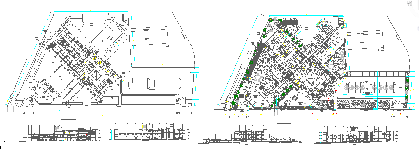 The exterior portion of the drawing highlights thoughtfully planned landscape areas, green pockets, and parking layouts that complement the hospital’s architectural structure. The elevation and section views provide insight into the building’s vertical composition, structural alignment, and façade treatment. These details offer valuable guidance for architects and engineers developing large-scale healthcare projects. With clear zoning, accessible pathways, and realistic proportions, this DWG file serves as a reliable reference for architects, civil engineers, and healthcare planners working on modern hospital design. It combines spatial efficiency, patient comfort, and structural clarity to meet contemporary medical facility standards.