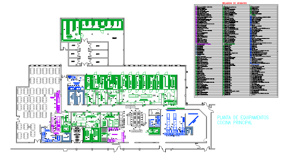 The right side of the drawing features a detailed equipment schedule listing every appliance, table, counter, and storage unit used in the design. This allows architects, engineers, and kitchen planners to verify specifications and coordinate installation effectively. The layout also includes separate sections for dining areas, service corridors, and support rooms, showing how the kitchen integrates with the overall restaurant facility. With precise measurements and organised zoning, this AutoCAD plan is an essential reference for designing hotel kitchens, commercial restaurants, industrial catering units, and institutional food service facilities. It provides a practical and accurate representation of a fully equipped modern kitchen built for professional use.
