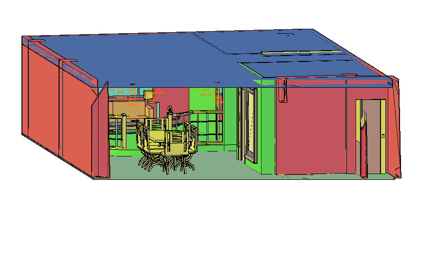 3D view of apartment dwg file in 3d view with view of wall,door,entry way,designer dining table and light positional view.
