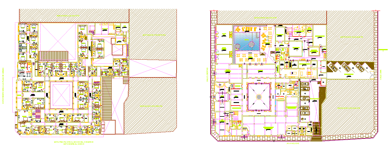 This Modern Hotel Layout Floor Plan showcases a carefully planned architectural design created to meet the needs of contemporary hospitality projects. The drawing presents two detailed floors, each strategically organized to enhance guest comfort, operational efficiency, and aesthetic appeal. The layout features a large number of well-arranged guest rooms connected through wide corridors that promote smooth movement throughout the building. Central to the design is an open courtyard, allowing natural light and ventilation to flow into the surrounding spaces, creating a pleasant and refreshing atmosphere for visitors.