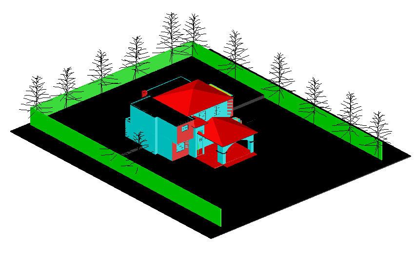 House 3D view design dwg file in view with ground area with entry way,coat,tree view around its wall and support view with pyramid shaped terrace area and balcony and door and window area view in designer 3d house.