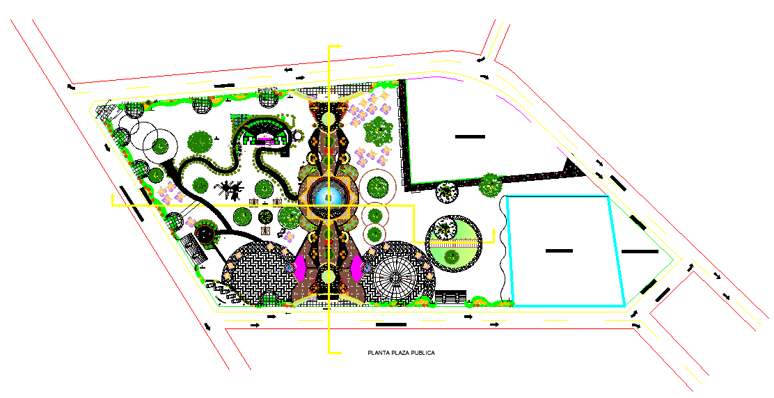 The plan further integrates essential Club House functions such as areas for a gym, mini market, snack bar, and swimming pool, represented through architectural zoning and spatial organisation. Decorative elements such as patterned flooring, tree clusters, fountains, and pavilion-style structures enhance the aesthetics of the overall layout. Surrounding road networks, entry points, and directional flow markings help professionals understand vehicular movement and site connectivity.
