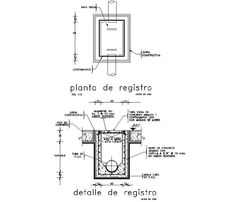 Main hole plan and section detail dwg file, with PVC pipe detail, concert mortar detail, dimension detail, naming detail, hole detail, etc.