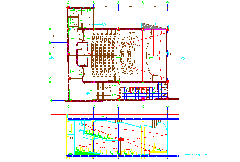 Auditorium Hall area plan and section view of hotel dwg file in plan with view of area view with wall,auditorium hall view with seating area with stage view and washing area
