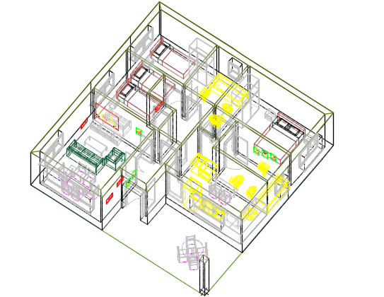 Equipped house 3 D plan detail dwg file, with architect plan detail, furniture detail in the sofa, table, chair, door and window detail, etc.