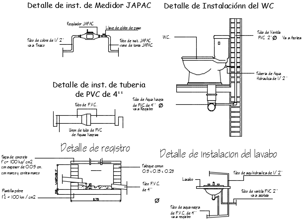 Plumbing sanitary detail dwg file, including PVC pipe detail, water closed section detail, sink section detail, dimension detail, naming detail, etc.