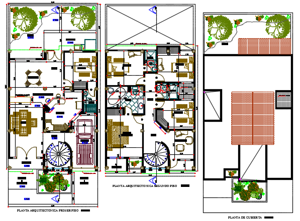 Architect design house plan detail dwg file, including section line detail, landscaping detail in tree and plant detail, dimension detail, naming detail, spiral stair detail, etc.