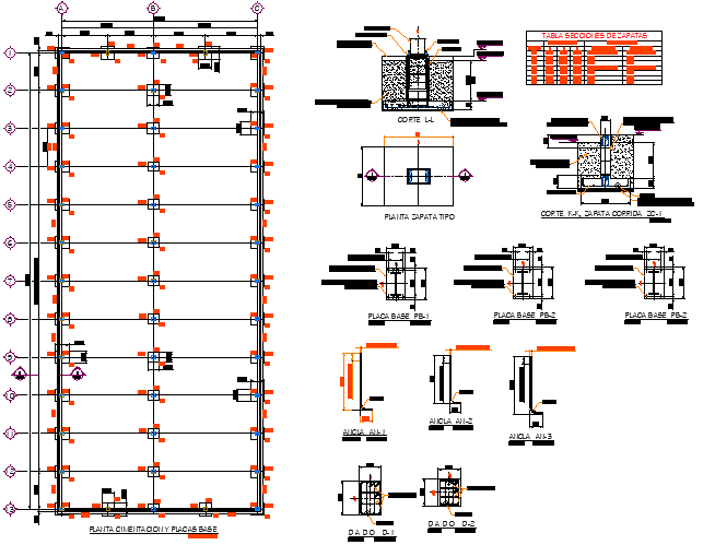 Foundation plan and section detail dwg file, with column naming detail, table specification detail, centre line plan detail, etc.