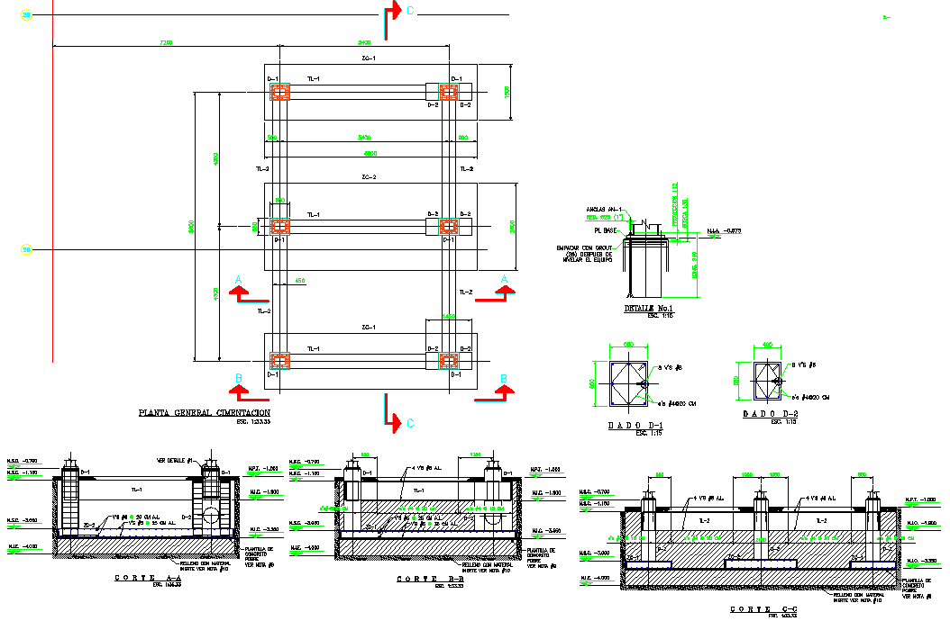 Detail of foundation and section plan dwg file, including section line detail, bolt nut detail, reinforcement detail, bolt nut detail, etc.