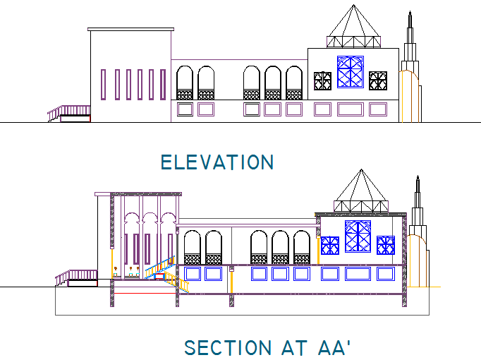 Mosque elevation and section detail dwg file, including front elevation detail, section A-A’ detail, stair detail, etc.