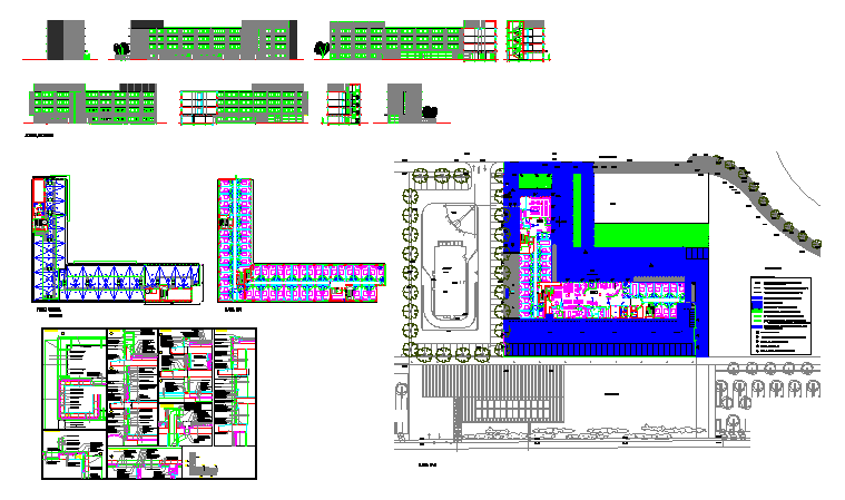 This Hotel Detail Project layout presents a comprehensive architectural design including floor plans, elevations, and site layout. The plan highlights functional zoning for guest rooms, reception, dining areas, and outdoor amenities. It also includes landscape detailing, driveway alignment, and parking areas, ensuring smooth movement and efficient space management throughout the property.