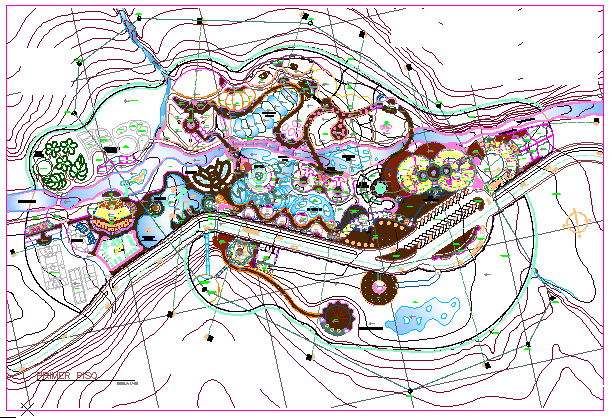 This Eco Tourism DWG plan showcases a 280x160 meter master landscape layout designed with natural contours, ecological activity zones, and environmental learning spaces. The drawing highlights multiple wildlife habitats, including areas for felines, birds, bears, nocturnal species, domestic animals, and specialized environments such as terrarios and viveros. The site is organized around artificial lagoons, stepped platforms, and organic circulation routes, all integrated into the topography. The plan includes observation points, mirador terraces, cultural plazas, amphitheatre zones, picnic areas, and recreational courtyards, creating a complete eco-tourism experience. Path networks, bridges, and cycling routes connect the entire landscape, offering a fluid movement system across the terrain.