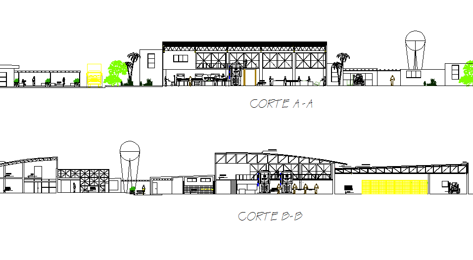 Section Juice processing plant detail dwg file, with landscaping detail in tree and plant detail, section A-A’ detail, section B-B’ detail, etc.