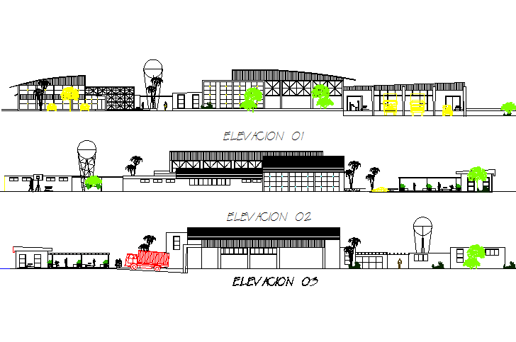 Elevation Juice processing plant detail dwg file, including steel structural detail, landscaping detail in tree and plant detail, furniture detail in door and window detail, etc.