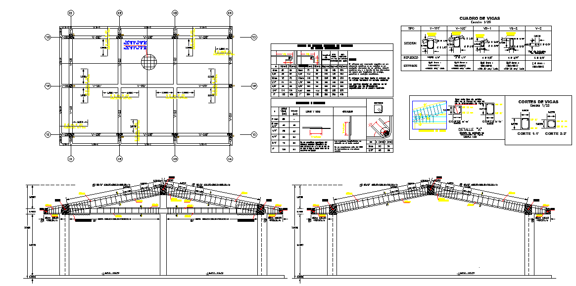 This Play Room Structural Design Layout provides a complete architectural and structural representation featuring floor framing, roof beam placement, and detailed elevation views. The plan includes beam schedules, reinforcement notes, sectional cuts, and precise construction dimensions that guide accurate on-site implementation. The roof beam layout clearly shows slope direction, ridge connection, and beam-to-column integration, ensuring proper load transfer and structural balance. Each structural component, including columns, beams, and connection points, is illustrated with clarity to support safe and efficient construction.