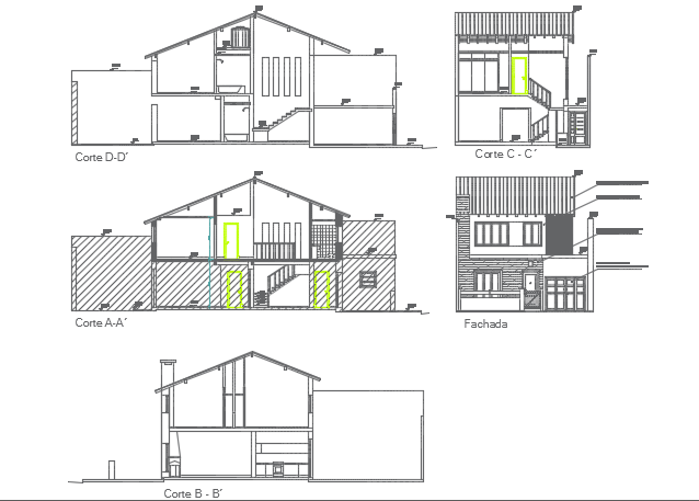 Section and elevation house plan detail dwg file, including front elevation detail, section A-A’ detail, section B-B’ detail, section C-C’ detail, section D-D’ detail, etc.